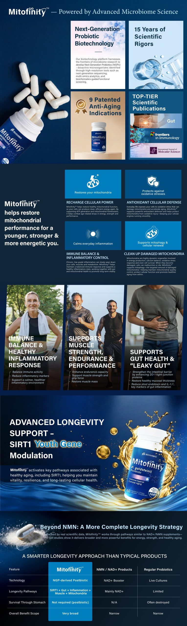 MITOFINITY™, a postbiotic from our proprietary Next-Generation probiotic strain Parabacteroides goldsteinii RV-01, is designed to support mitochondrial health and cellular vitality, backed by robust in-vivo and mechanistic data with over 15 years of RD.